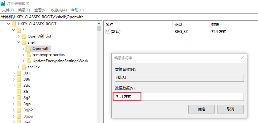 HKEY_CLASSES_ROOT,展开*文件,新建OpenWith文件,双击右侧窗口“默认”,编辑字符串,数值数据填写为“打开方式”。