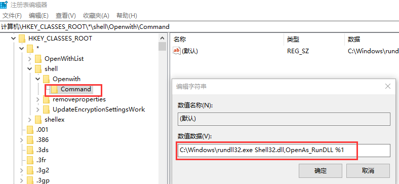 OpenWith文件下,新建Command文件, 双击右侧窗口“默认”,编辑字符串,数值数据填写为“C:\Windows\rundll32.exe Shell32.dll,OpenAs_RunDLL %1” 。